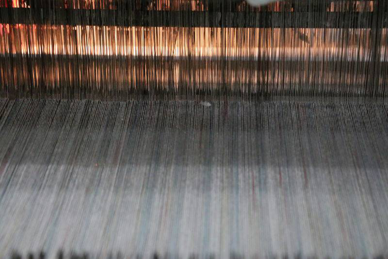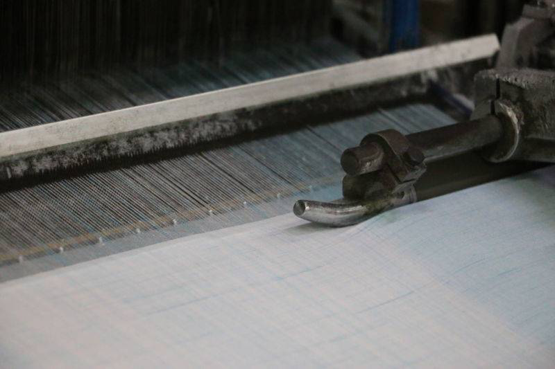 除了布料的选择,布的织法也很有讲究。织法决定了布料的密度,为了能让艾绒的挥发油散发出来,而艾绒又不易渗出,布料的密度要高一些。最后我们决定了用32支的棉纱来织布,而经纬的纱线数在一英寸里面分别选用了77支。